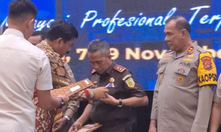 Piagam penghargaan dan pin emas diberikan langsung oleh Menteri ATR/BPN Hadi Tjahyanto kepada Kajati Sulut, di Hotel Grand Mercure Kemayoran, Jakarta Pusat, Rabu (08/11/23).