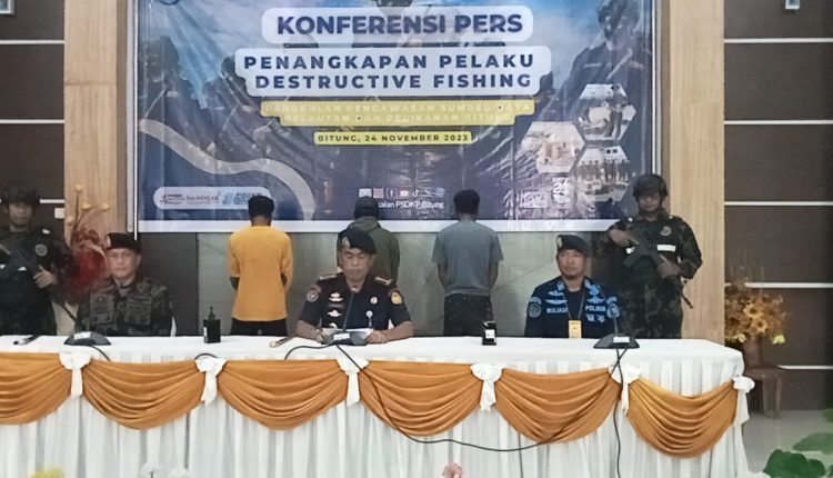 BITUNG —Kementerian Kelautan dan Perikanan (KKP) menangkap 3 (tiga) orang nelayan yang diduga melakukan penangkapan ikan menggunakan bahan peledak (destructive fishing) di perairan Pulau Kokoila, Kecamatan Menui Kepulauan, Kabupaten Morowali, Sulawesi Tengah, Rabu (15/11/2023).