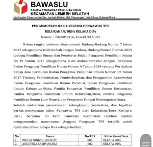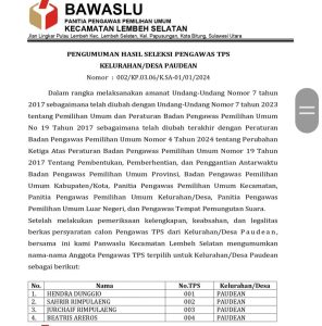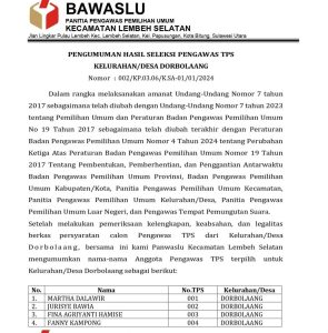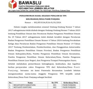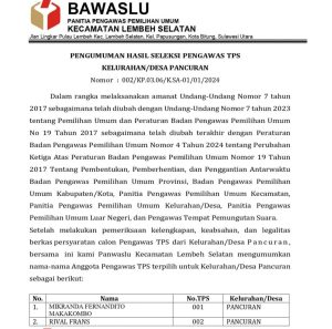 Pengumuman 34 Pengawas TPS itu berdasarkan berita acara hasil Rapat Pleno Nomor: 002/KP.03.06/K.SA-01/01/2024 tanggal 20 Januari