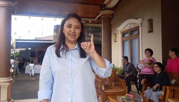 MINUT_Ketua Tim Kampanye Daerah (TKD) Prabowo-Gibran Minahasa Utara Cynthia Imelda Erkles memberikan hak suara di TPS 8 Desa Warukapas Kecamatan Dimembe, Rabu (14/02/24).