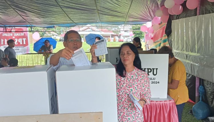 BITUNG — Sukseskan pemilu 2024, Wawali Hengky Honandar bersama keluarga berikan hak suara di TPS 011 Kelurahan Madidir Ure, Kecamatan Madidir, Kota Bitung, Rabu (14/2/2024).