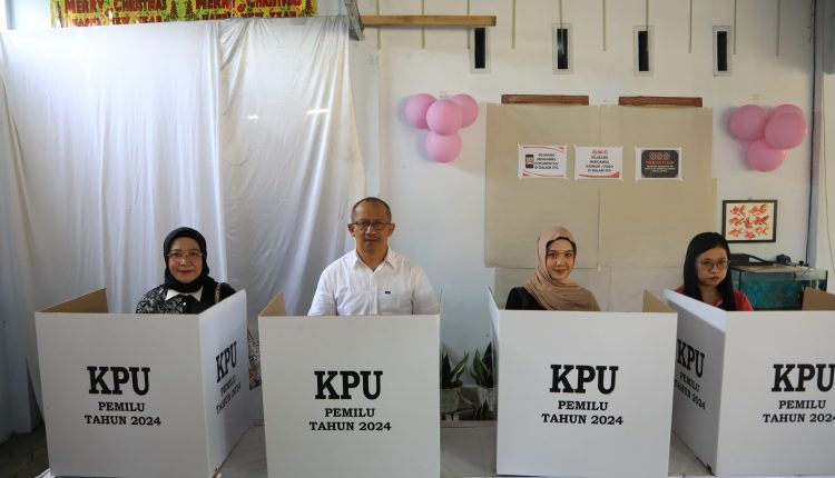 KOTAMOBAGU – Penjabat (Pj) Wali Kota Kotamobagu, Asripan Nani dan Ketua TP PKK Siti Fatmah Fitriana Nani Buhang, berikan hak suara Pemilu di TPS 18 Kelurahan Kotobangon, Rabu (14/2/2024).