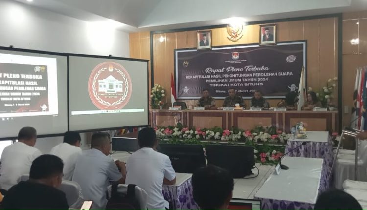 BITUNG — Ketua Komisi Pemilihan Umum (KPU) Kota Bitung, Deslie Sumampouw, SE membuka secara resmi Rapat Pleno Rekapitulasi Hasil Perhitungan Perolehan Suara pemilihan umum tahun 2024, dibAula kantor KPU Kota Bitung, Jumat (1/3/2024).