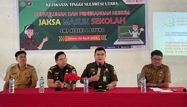 MANADO_Kejaksaan Tinggi Sulawesi Utara melalui Seksi Penerangan Hukum dan Humas bidang Intelijen, melaksanakan kegiatan Penyuluhan dan Penerangan Hukum Jaksa Masuk Sekolah (JMS) di SMP Negeri 4 Bitung, Kelurahan Papusungan, Kecamatan Lembeh Selatan (Pulau Lembeh), Kota Bitung, Selasa (02/04/24).