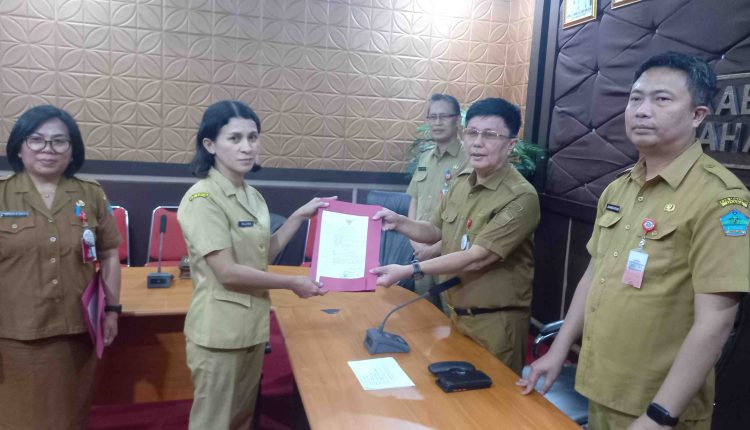 MINUT, indo-news.id_ Sekretaris Daerah Novly Wowiling menyerahkan surat perintah Pelaksana tugas (Plt) Kepala Dinas Pangan dan Plt Kabag Perencanaan dan Keuangan Setdakab, di Ruang Meeting Bupati Minut, Selasa (30/04/24).