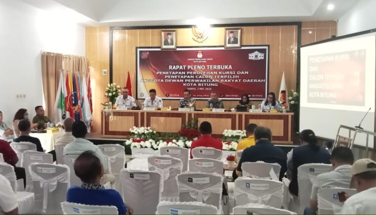BITUNG—Komisi Pemilihan Umum (KPU) Kota Bitung laksanakan Rapat Pleno Terbuka penetapan perolehan kursi dan penetapan calon terpilih Anggota Dewan Perwakilan Rakyat Daerah (DPRD) Kota Bitung, Kamis (2/5/2024).