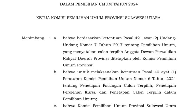 Berikut Keputusan Pleno KPU Sulut hasil pemilihan Caleg DPRD Sulut Periode 2024-2029 berdasar Daerah Pemilihan (Dapil),KLIK DISINI