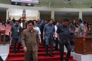 Rapat paripurna dipimpin Ketua DPRD Sulut dr. Fransiscus Andi Silangen Sp.B-KBD didampingi Wakil Ketua Victor Mailangkay dan Raski Mokodompit, serta dihadir langsung Gubernur Sulut Olly Dondokambey dan Wakil Gubernur Steven Kandouw.