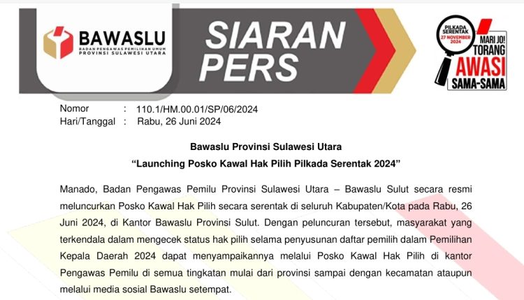 SULUT – Badan Pengawas Pemilu (Bawaslu) Sulut resmi meluncurkan Posko Kawal Hak Pilih secara serentak di seluruh Kabupaten/Kota pada Rabu, 26 Juni 2024, di Kantor Bawaslu Provinsi Sulut.
