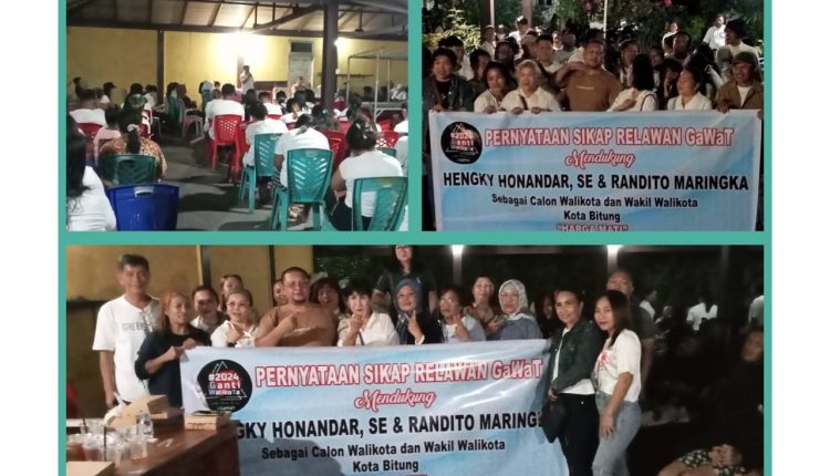 BITUNG — Ratusan relawan GAWAT deklarasi dukungan ke pasangan calon Wali Kota Bitung Hengky Honandar dan calon Wakil Wali Kota Bitung Randito Maringka, Senin (1/7/2024).