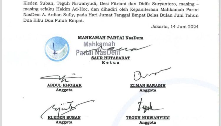 Berdasarkan salinan putusan dengan nomor 8/MPN/DPR-RI/VI/2024 tertanggal 14 Juni 2024 ditandatangani