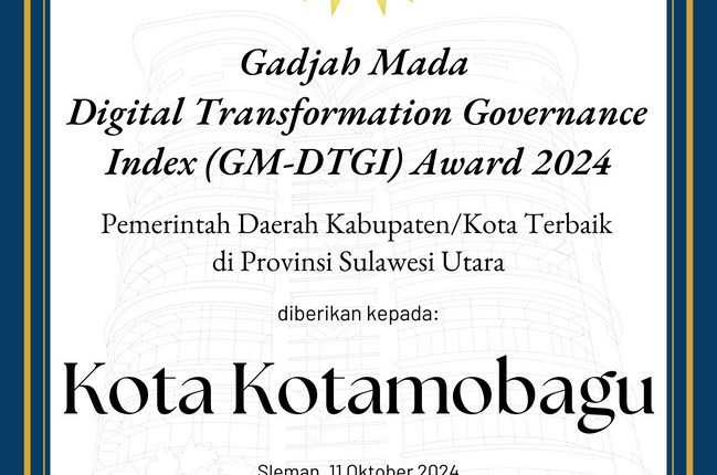 KOTAMOBAGU – Pemerintah Kota (Pemkot) Kotamobagu berhasil meraih penghargaan sebagai Pemerintah Daerah Terbaik di Provinsi Sulawesi Utara pada ajang Gadjah Mada Digital Transformation Governance Index (GM-DTGI) Award 2024.