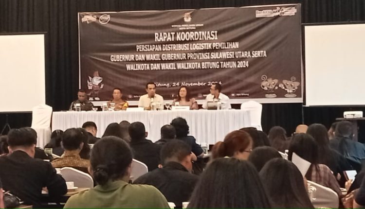 BITUNG — Komisi Pemilihan Umum (KPU) Kota Bitung melaksanakan Rapat Koordinasi (Rakor) persiapan distribusi logistik pemilihan Gubernur dan Wakil Gubernur serta Wali Kota dan Wakil Wali Kota tahun 2024 di Fave Hotel, Minggu (24/11/2024).