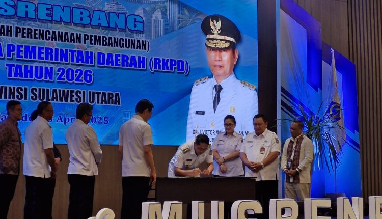 MINUT—Wali Kota Bitung, Hengky Honandar, mendapat kehormatan sebagai perwakilan dari seluruh Bupati dan Wali Kota se-Sulawesi Utara untuk menandatangani berita acara Musyawarah Perencanaan Pembangunan (Musrenbang) Provinsi Sulawesi Utara tahun 2026.