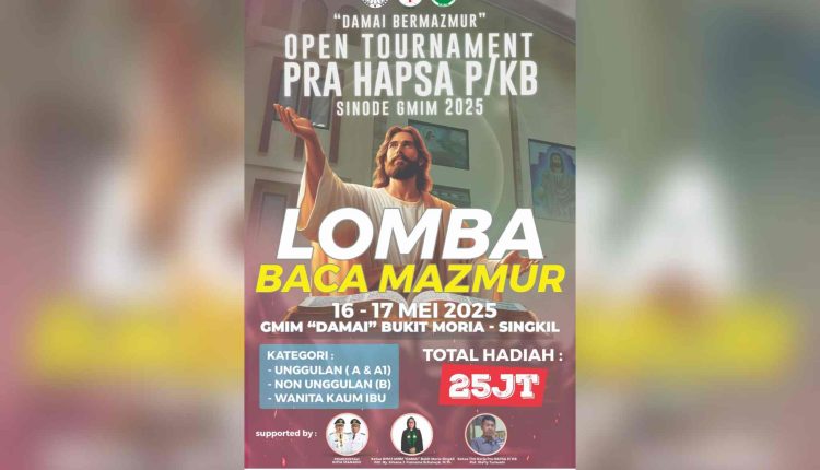 MANADO – Antusiasme jemaat menyambut lomba baca Mazmur dalam rangkaian kegiatan “Damai Bermazmur” jelang HAPSA (Hari Persatuan) P/KB (Pria Kaum Bapa) GMIM semakin meningkat. Hingga Senin (5/5/2025), tercatat lebih dari 100 peserta telah resmi mendaftarkan diri.