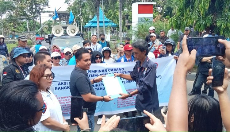 BITUNG—Puluhan buruh dari Federasi Serikat Pekerja Rokok Tembakau Makanan Minuman Serikat Pekerja Seluruh Indonesia (FSP RTMM-SPSI) Kota Bitung menggelar aksi damai di halaman Kantor Wali Kota Bitung, Jumat (9/5/2025).