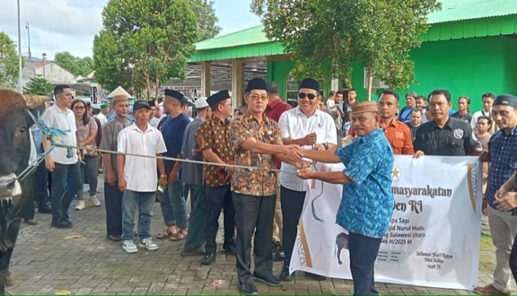 Penyerahan hewan kurban dilakukan langsung oleh Wali Kota Bitung, Hengky Honandar SE, didampingi Wakil Wali Kota Randito Maringka dan Sekretaris Daerah, Ir. IGN Rudy Theno ST MT, di Masjid Nurul Huda, Kelurahan Bitung Timur, Kecamatan Maesa, Kamis (5/6/2025).