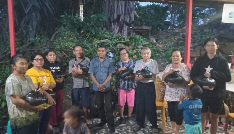 Pembagian beras gratis oleh Jems Tuuk disalurkan oleh Josep Lahopang kepala Jaga Lingkungan V jalan Sea.