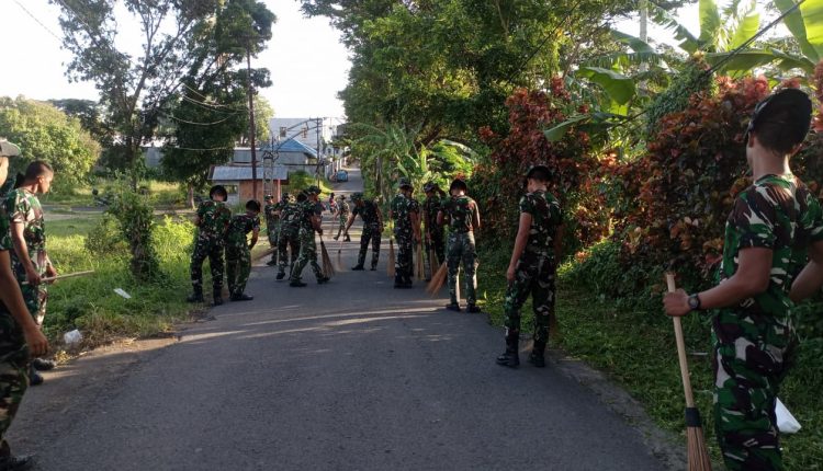 Karya Bakti bersih-bersih jalan dan selokan air melibatkan 25 personel TNI dan 20 warga setempat, dimulai sejak pukul 06.00 WITA dengan peralatan sederhana seperti mesin rumput, sapu lidi dan sekop.