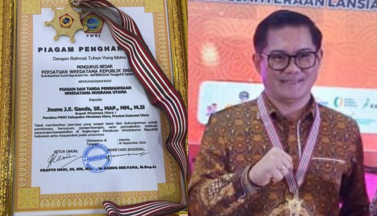 Indo-news.id_ Bupati Minut Joune James Esau Ganda, SE., MAP., MM., M.Si., menerima penghargaan Wredatama Nugraha Utama dari Pengurus Besar Persatuan Wredatama Republik Indonesia (PWRI) dalam acara penganugerahan nasional yang berlangsung di Gedung Graha Wredatama PWRI, Jakarta Selatan, Minggu (05/10/25) pagi.