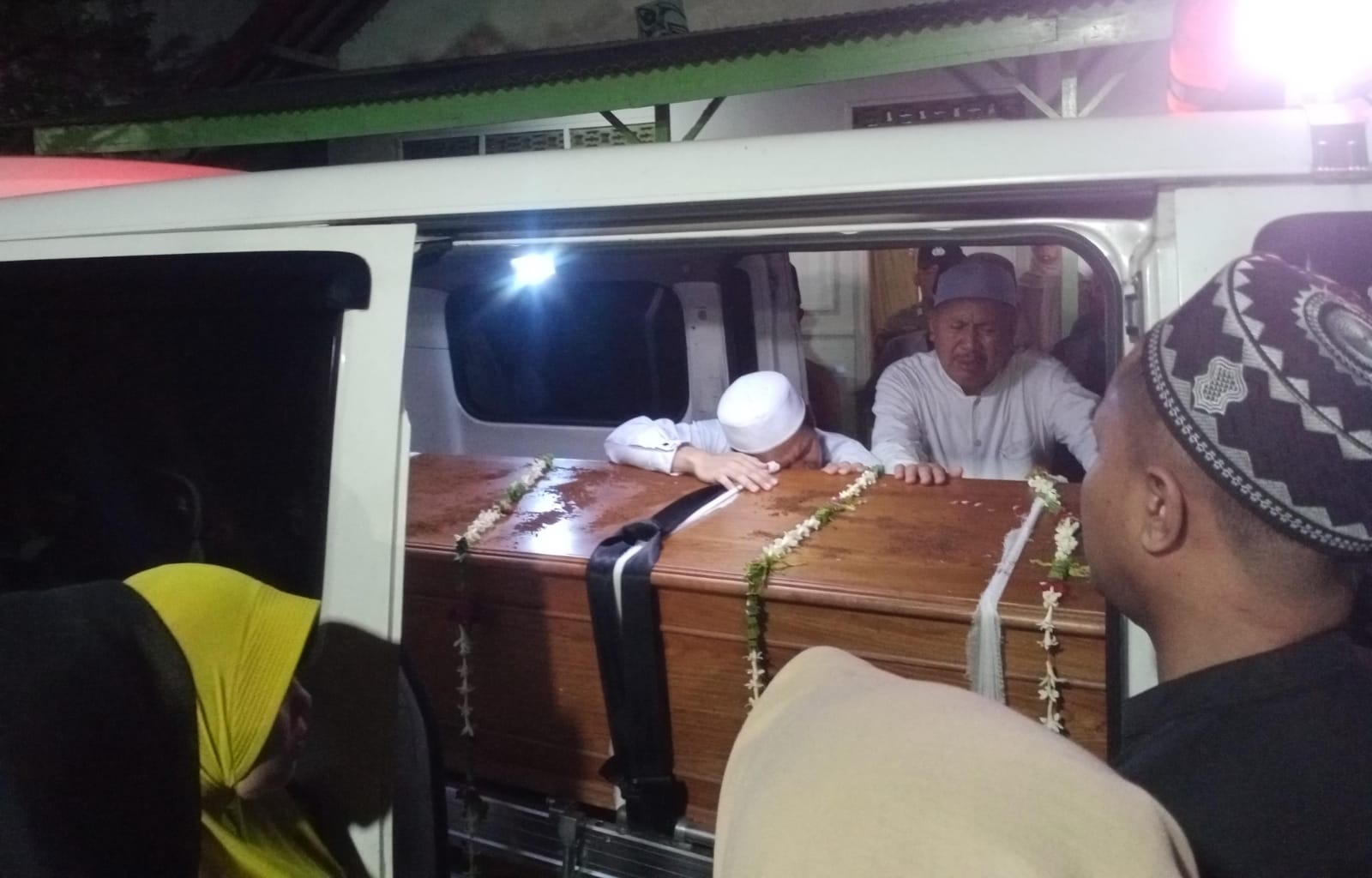 Kedatangan jenazah disambut haru ratusan warga yang memadati rumah almarhum. Tangis keluarga pecah saat peti jenazah di ambulans datang dan disambut dengan doa bersama.