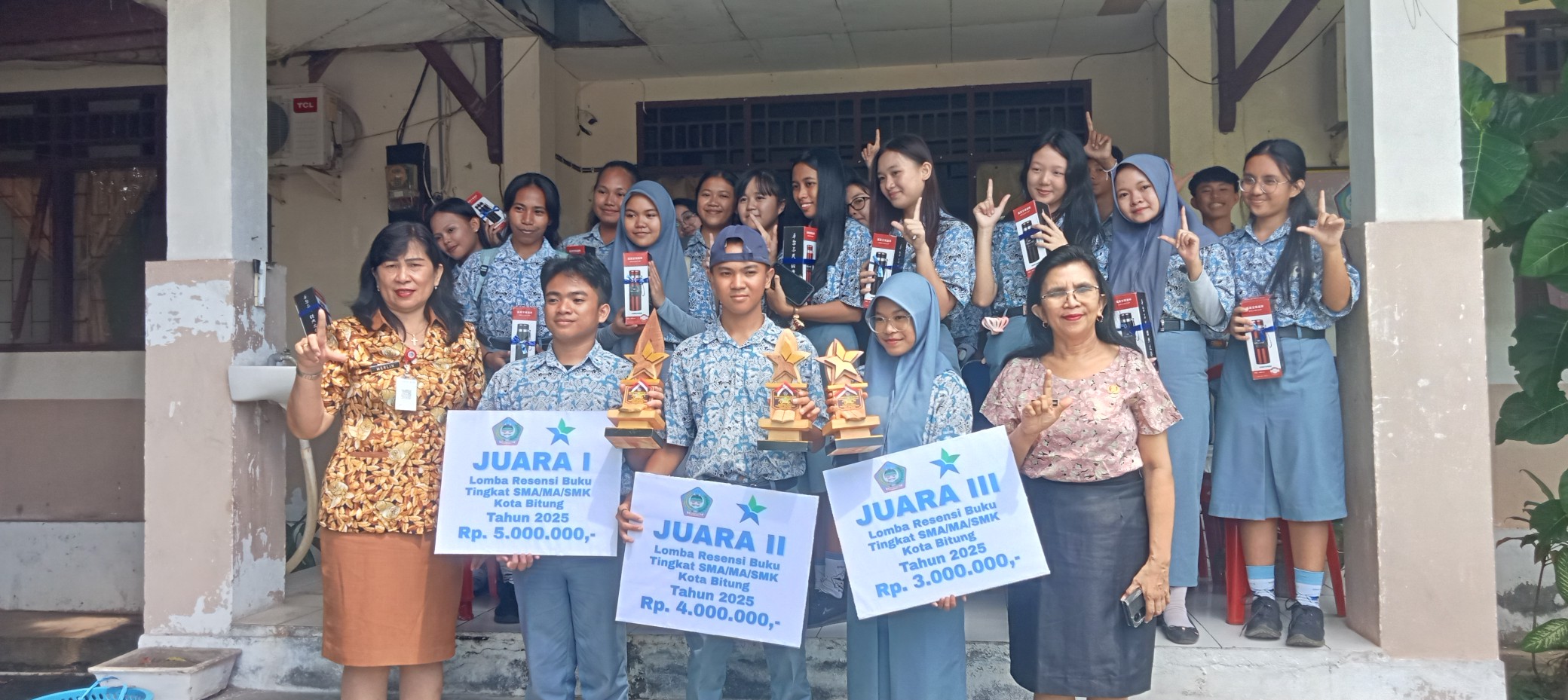 Pada kesempatan yang sama, Merlin juga menyerahkan piala dan uang tunai bagi para pemenang lomba resensi buku tingkat SMA/SMK Kota Bitung tahun 2025 sebagai bentuk apresiasi atas semangat literasi yang terus tumbuh di kalangan pelajar.