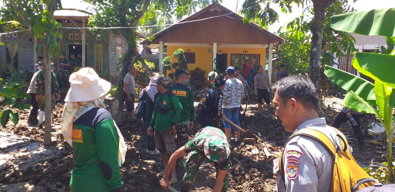 Kegiatan yang berlangsung hingga pukul 14.00 Wita tersebut berjalan dengan aman, lancar, dan penuh semangat gotong royong. Warga terlihat antusias bekerja bersama aparat TNI-Polri membersihkan lumpur dan puing-puing sisa banjir di rumah dan fasilitas umum.