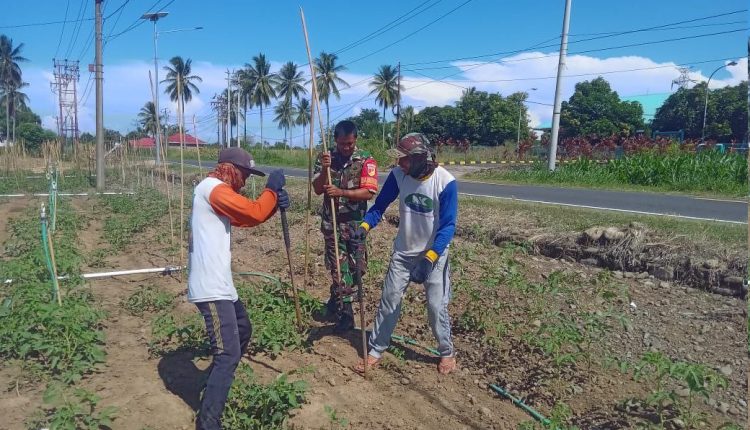 Babinsa Turun ke Kebun, Bantu Petani Buat Lanjaran Tomat