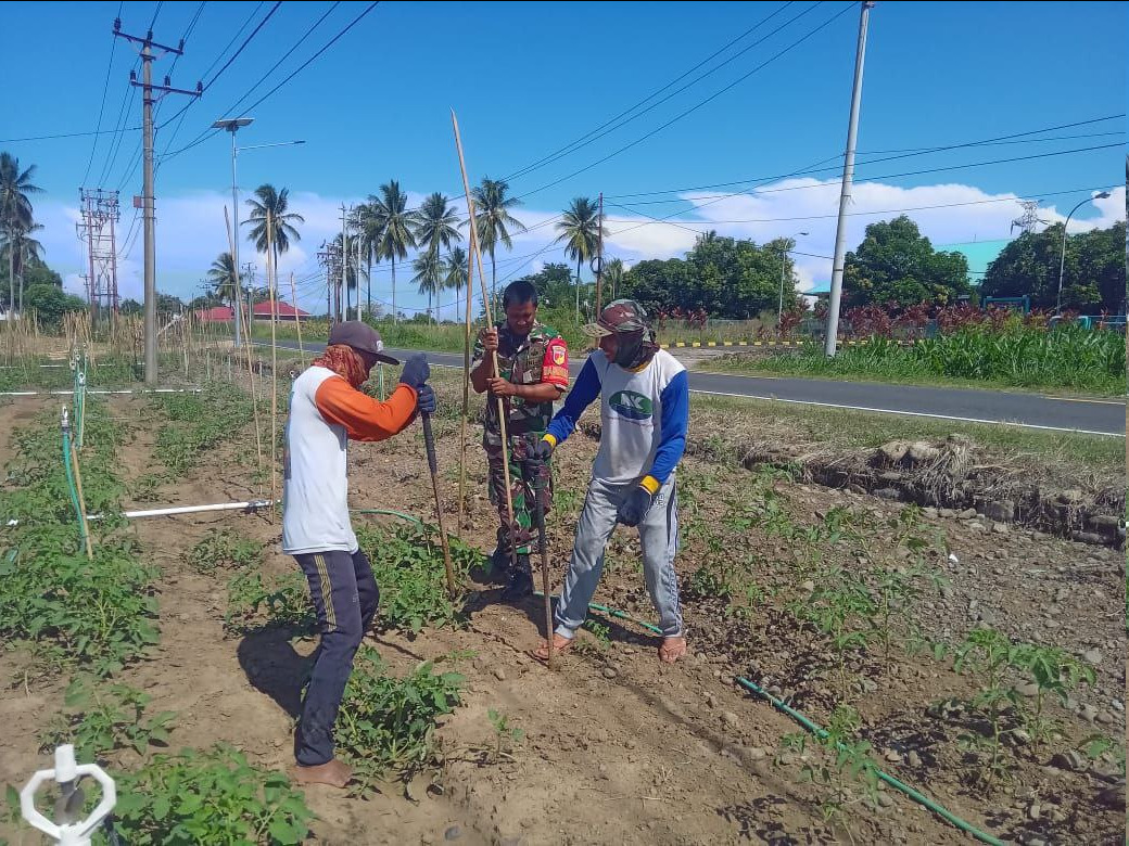 Dengan tangan yang biasa memegang senjata, hari itu Babinsa Sertu Musoleh justru sibuk menancapkan bambu dan mengikat batang tomat satu per satu.