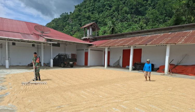 Kebersamaan Babinsa dan Petani Warnai Aktivitas Jemur Padi di Tungoi 1