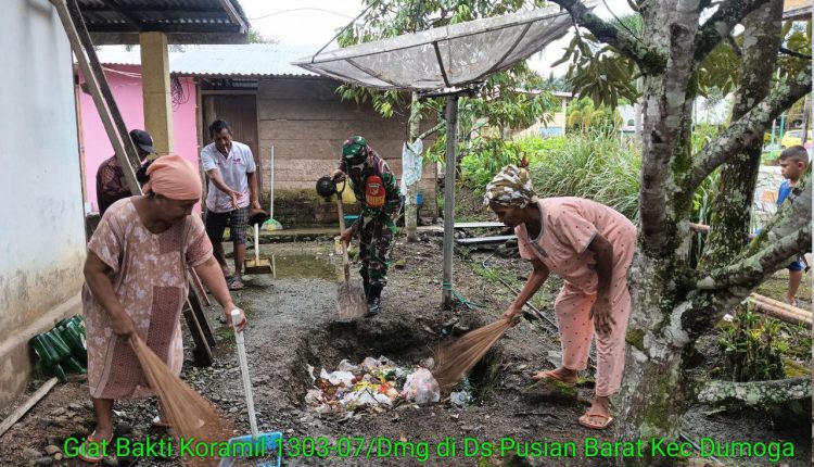 Kegiatan yang berlangsung sekitar pukul 08.45 Wita tersebut difokuskan pada pembersihan pekarangan rumah warga yang berada di Desa Pusian Barat, Kecamatan Dumoga, Kabupaten Bolaang Mongondow. Babinsa turun langsung membantu warga membersihkan lingkungan sekitar sebagai wujud kepedulian TNI terhadap kebersihan dan kesehatan masyarakat.