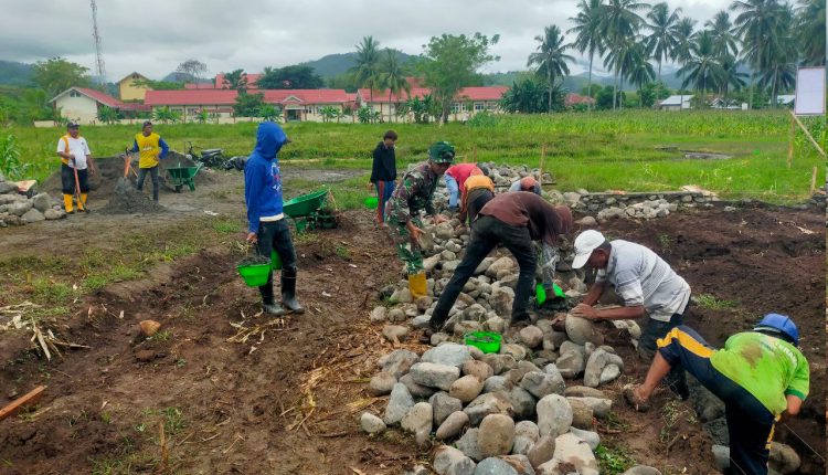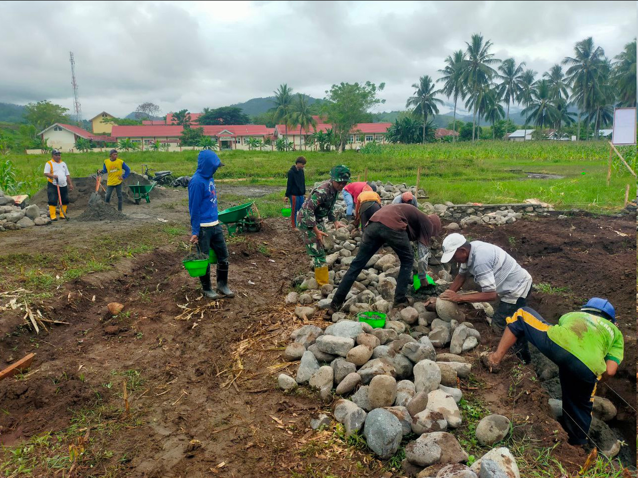 Pada kegiatan hari ini, progres pembangunan meliputi pengumpulan material batu dan pasir, pembuatan boplang, serta pemasangan pondasi awal, dengan capaian hasil pembangunan mencapai 3,52 persen. Proses pengerjaan dilakukan secara gotong royong dengan melibatkan 13 orang masyarakat setempat dan didukung oleh 2 personel TNI, mencerminkan sinergi yang kuat antara TNI dan rakyat.