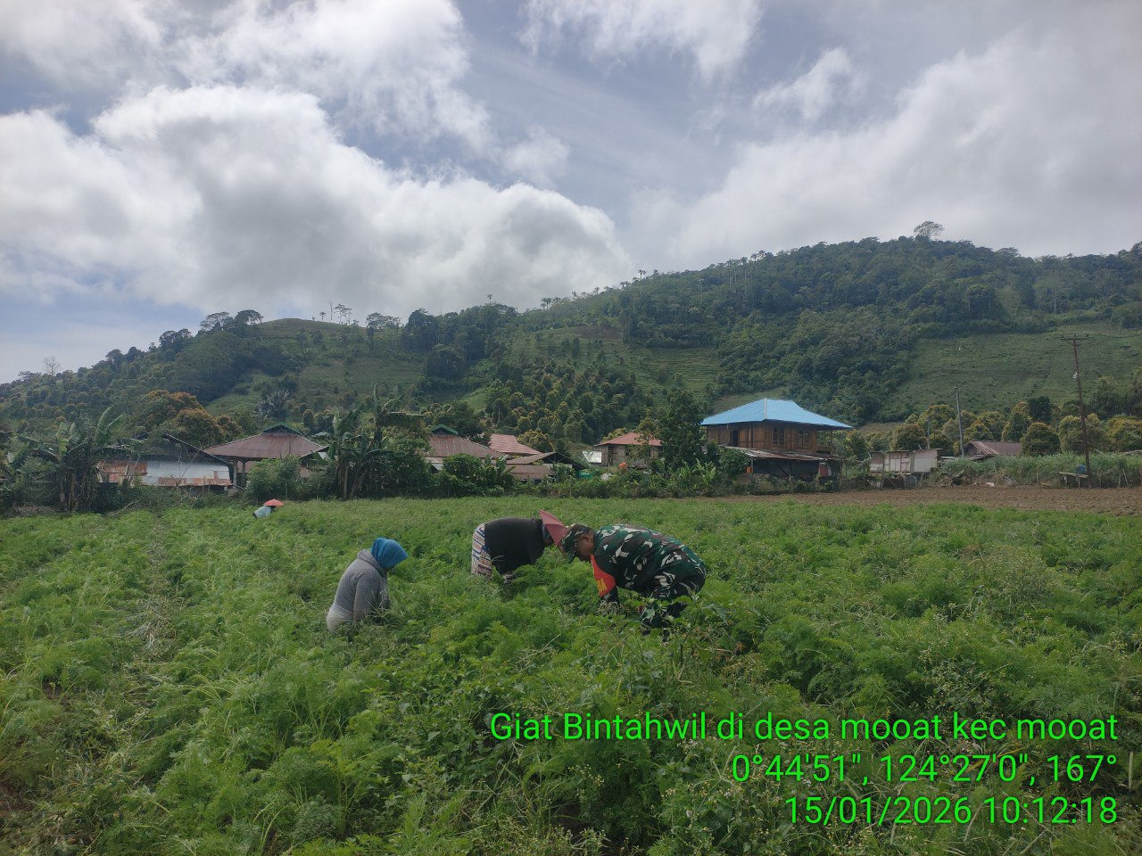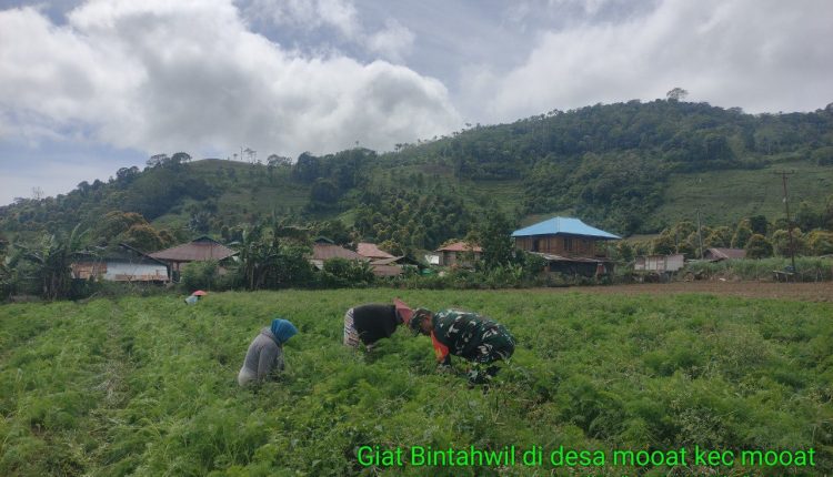 Kegiatan tersebut dilaksanakan pada Minggu, 11 Januari 2026 di Desa Mooat Kecamatan Mooat Kabupaten Bolaang Mongondow Timur, sebagai bagian dari pembinaan ketahanan wilayah atau Bintahwil di wilayah binaan. Dalam kegiatan ini, Sertu Tahir Ali membantu membersihkan gulma atau rumput liar yang mengganggu pertumbuhan tanaman wortel milik warga setempat.
