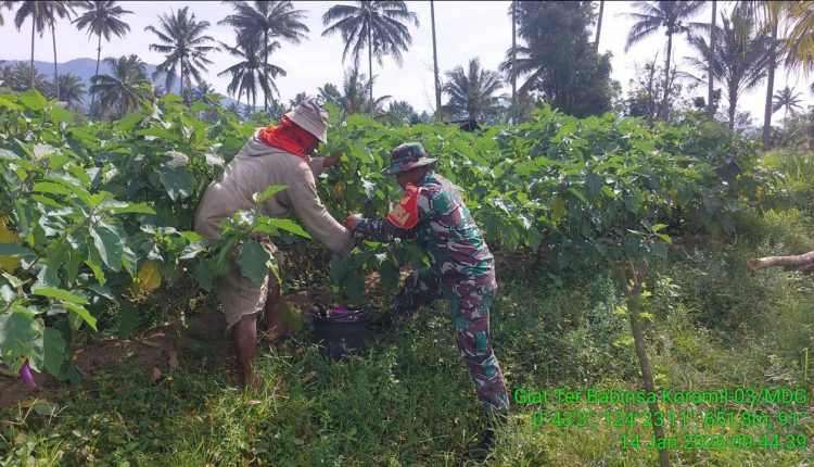 B O L T I M – -Sebagai wujud nyata kepedulian dan kedekatan TNI dengan masyarakat, Babinsa Koramil 1303-03/Modayag Praka Jaya Arfian, melaksanakan kegiatan Bintahwil (Pembinaan Ketahanan Wilayah) dengan membantu warga memanen hasil pertanian, Rabu (14/01/2026).