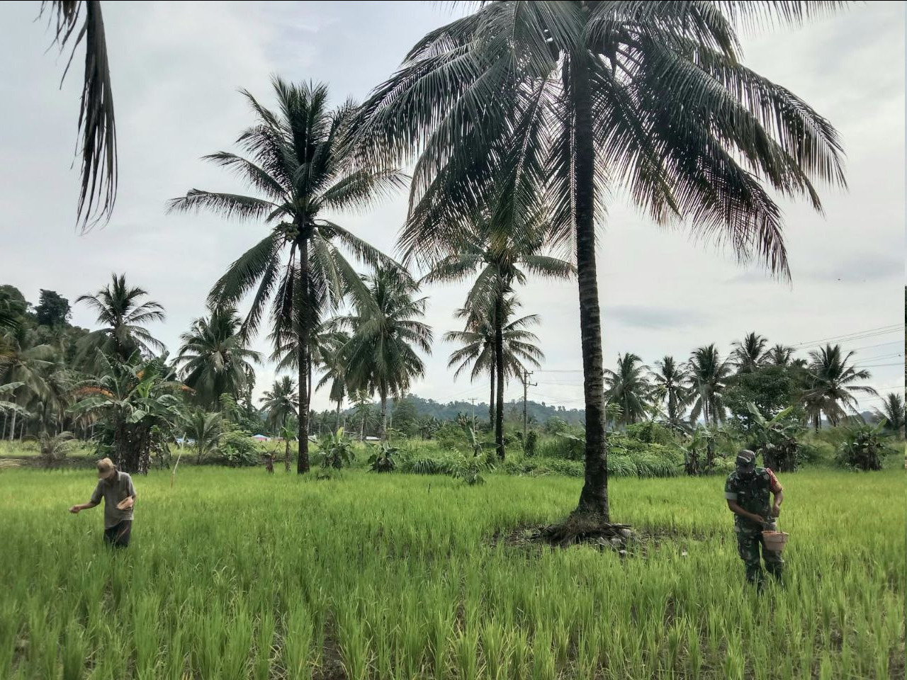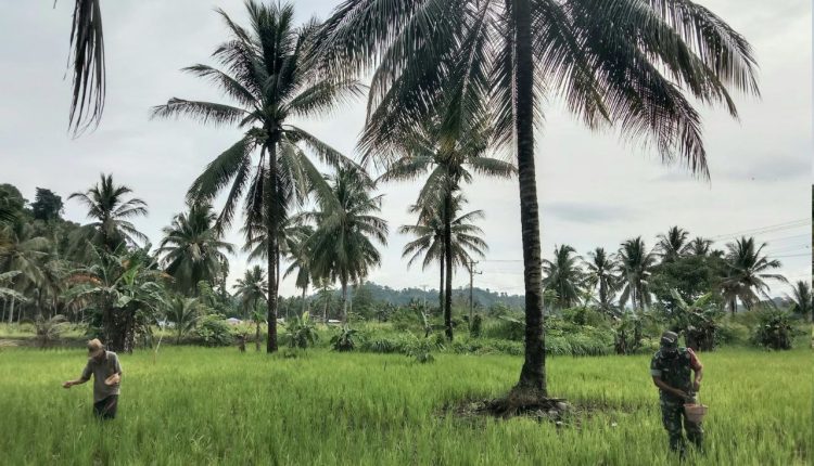 Personel Koramil 1303-11/Lolak, Sertu Ronald T. Wuaten, melaksanakan kegiatan Pembinaan Ketahanan Wilayah (Bintahwil) dengan membantu proses pemupukan di lahan milik Bapak Eri Pontolawokang. Di atas lahan seluas 0,5 hektare tersebut, mereka bahu-membahu merawat tanaman padi varietas Rambo dengan menggunakan pupuk Urea untuk memastikan pertumbuhan yang optimal.
