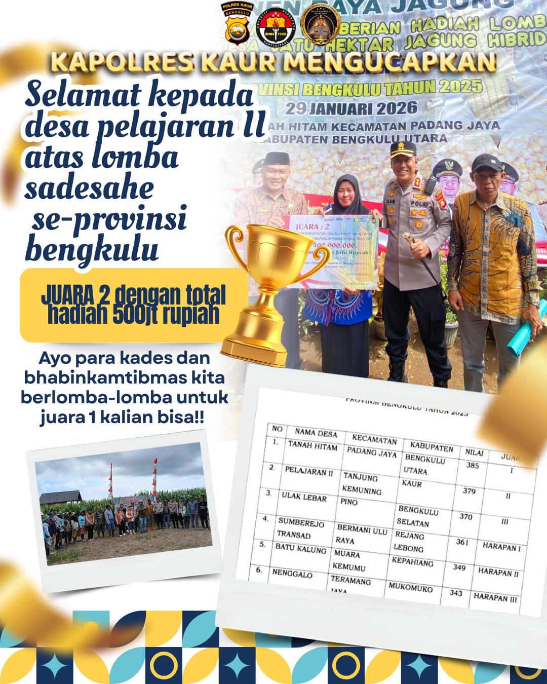 “Prestasi ini merupakan bukti bahwa sinergi antara aparat, pemerintah desa dan masyarakat mampu menghasilkan program yang nyata dan bermanfaat. Kami berharap keberhasilan ini menjadi motivasi bagi desa-desa lain di Kabupaten Kaur,” ujar Kapolres Kaur.