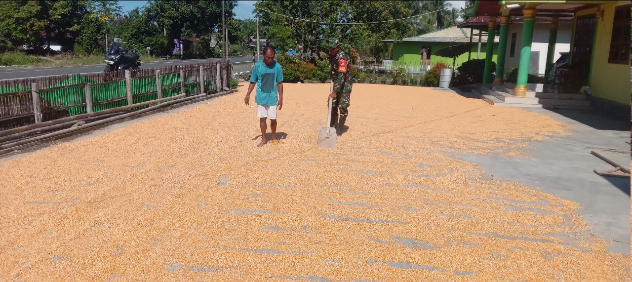 Aksi nyata ini merupakan wujud pengabdian tanpa sekat yang dilakukan aparat teritorial dalam mendampingi warga. Kopda Utomo tampak membaur bersama Bapak Sandre Beddu, menghampar dan merapikan butiran jagung di atas alas penjemuran guna memastikan kualitas hasil panen tetap terjaga sebelum dijual atau disimpan.
