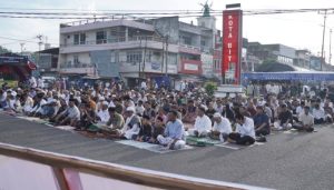 Kegiatan tersebut berlangsung khidmat dan penuh kebersamaan dengan diikuti ribuan umat Muslim yang telah memadati lokasi sejak pagi hari.