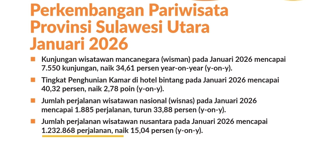 Capaian positif di awal tahun 2026 ini menjadi modal berharga bagi Pemerintah Provinsi Sulawesi Utara untuk terus mewujudkan visi Sulawesi Utara sebagai pusat pertumbuhan ekonomi baru di kawasan Pasifik melalui sektor pariwisata yang inklusif dan berkelanjutan.