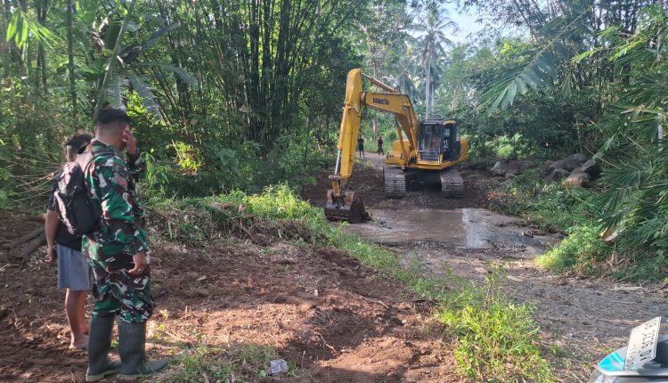 BOLMONG – Bintara Pembina Desa atau Babinsa Koramil 1303-04/Lolayan Kopda Tabah Bias Prahara, turun langsung memimpin kegiatan pembersihan lokasi pembangunan jembatan di Sungai Mopait. Dengan penuh semangat, ia bersama warga bahu-membahu menyiapkan lahan yang nantinya akan menjadi jalur penghubung vital antara Desa Mopait dan kawasan perkebunan Monsi, Rabu (08/04/2026).