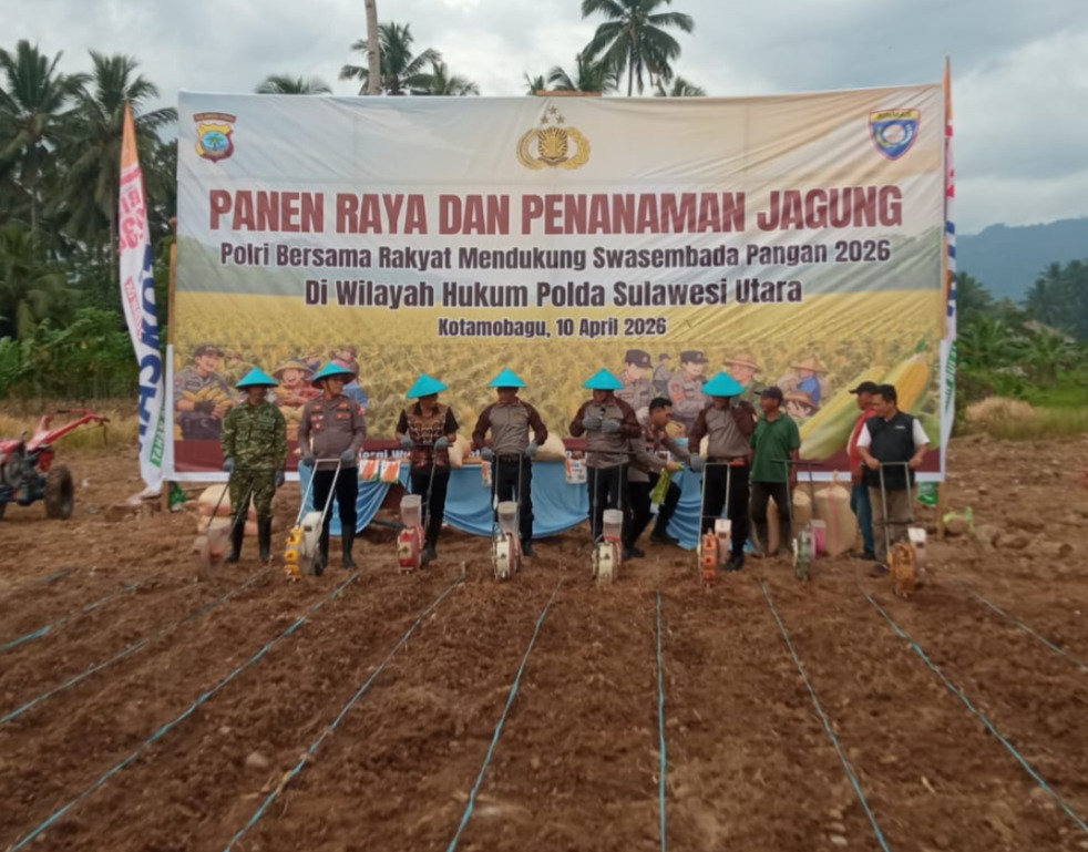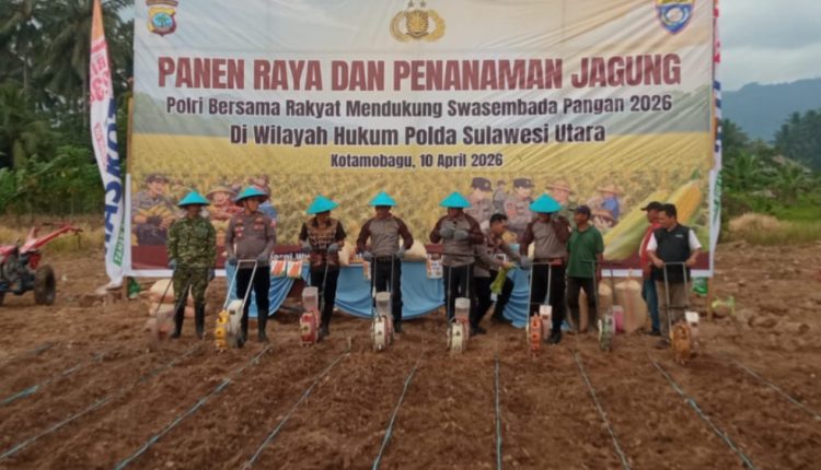 KOTAMOBAGU – TNI melalui Kodim 1303/Bolaang Mongondow menunjukkan komitmennya dalam mendukung program swasembada pangan nasional dengan menghadiri kegiatan panen raya dan penanaman jagung yang digelar Polri bersama masyarakat di Perkebunan Mokoit Kelurahan Motoboi Kecil Kota Kotamobagu, Jumat (10/04/2026).