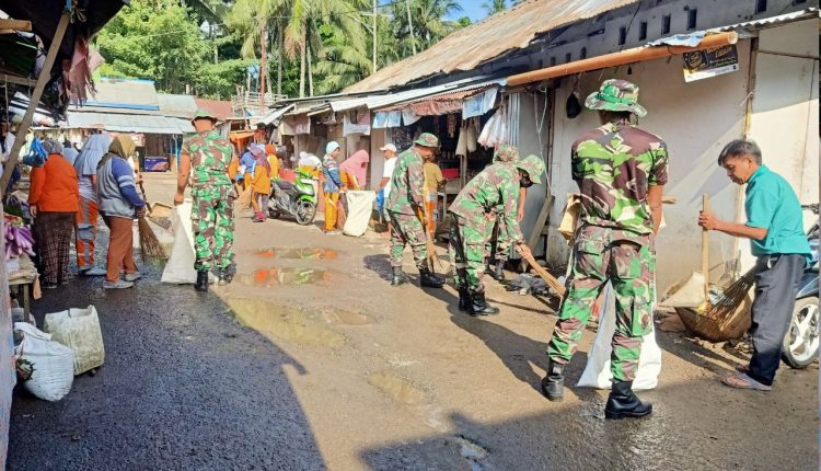 TNI Koramil 1303-01 Kotamobagu Gelar Giat Karya Bhakti Bersihkan Pasar Tradisional Desa Poyowa Kecil