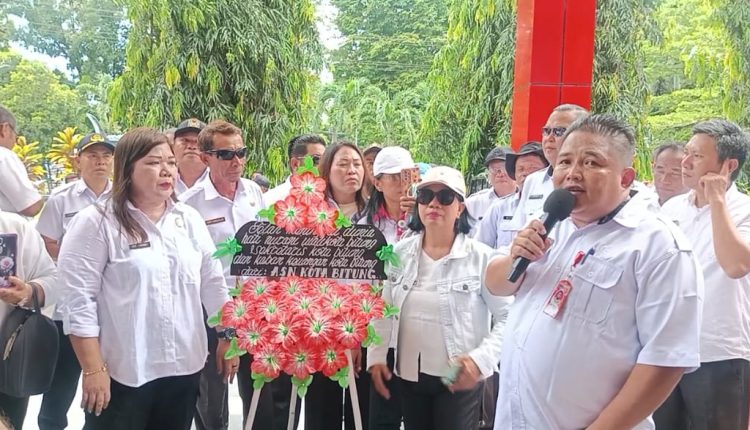 Dengan membawa krans ucapan dukacita yang ditujukan kepada Wali Kota Bitung, Maurits Mantiri, Sekretaris Daerah, Rudy Theno dan Kaban Keuangan, Franky Sondakh, para ASN dan THL memasuki kantor walikota bitung.